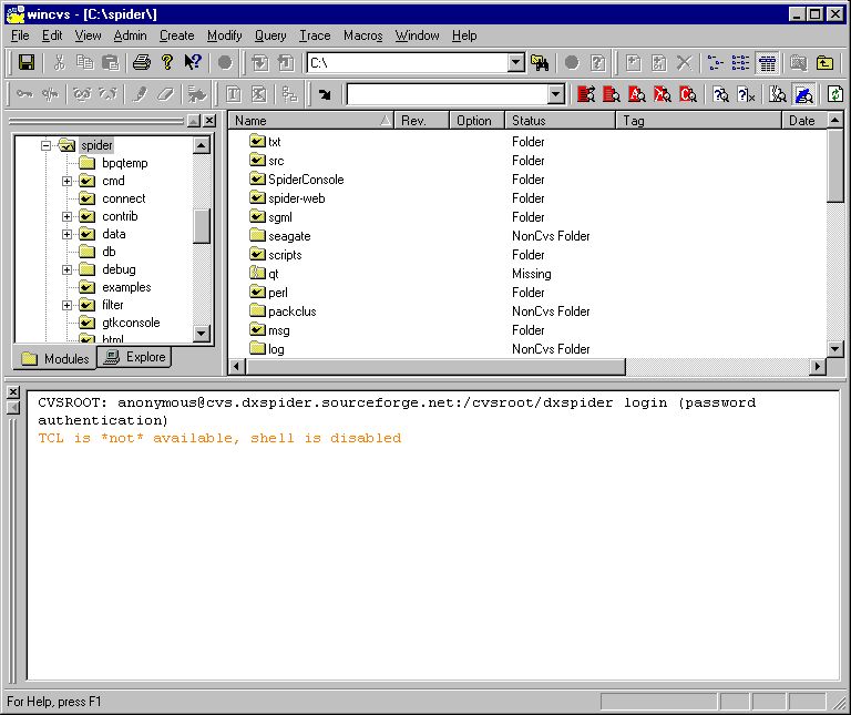 CVS stands for "Concurrent Versions System" and the CVS for DXSpider is held at Sourceforge. This means that it is possible to update your DXSpider installation to the latest sources by using a few simple commands. A graphical interface to CVS for Windows is explained in the next section.